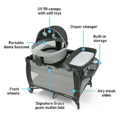 The Graco Pack ‘n Playยฎ Travel Domeโข LX Playard features a portable Travel Dome LX bassinet that can be used in or out of the home, so that you can keep baby by your side anywhere. The removable bassinet features a UV 50 canopy and carry bag, for comfort and convenience when you enjoy the backyard with baby or head to a park play date. When used on the playard, the bassinet can be positioned at eye level for easy check-ins throughout the night. This playard includes a removable quilted diaper changer with wipe-clean fabrics and an integrated storage area for baby’s essentials. The Graco playpen transitions with baby and can convert into a toddler playard with wheels for easy mobility around the home. Graco’s signature push-button fold makes it easy to fold up for storage. With Graco’s Travel Dome LX Playard, baby is ready to go wherever you go!